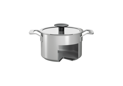Pannenset (4-delig) van robuust hoogwaardig roestvrij staal, deksel met stoomuitlaat aan de zijkant.